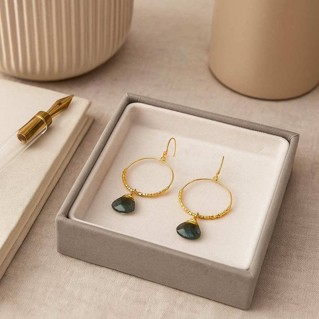 Beaded Gold Hoop Earrings Labradorite Gemstone Drop - Artisan Handmade Gift