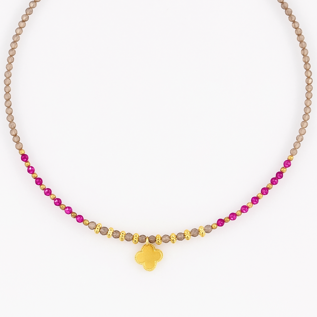 Fashion-forward necklace crafted with the finest Smoky Quartz, Rubellite & Hematites beads. The gleaming gold-plated charms and 4 leaf clover pendant !