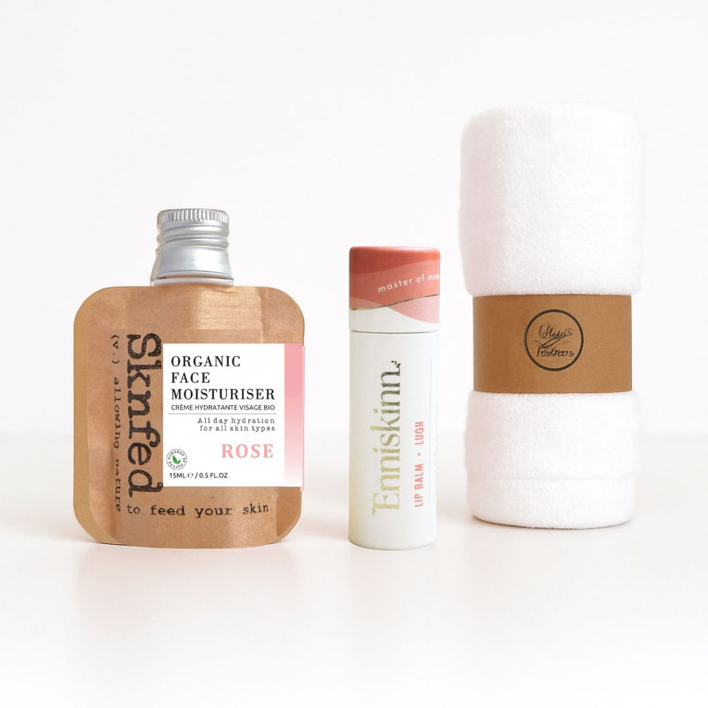 White face cloth + Orange & Bergamot Lip Balm (Enniskinn) + Mini Organic Rose Face Moisturiser 15ml (SKNFED)