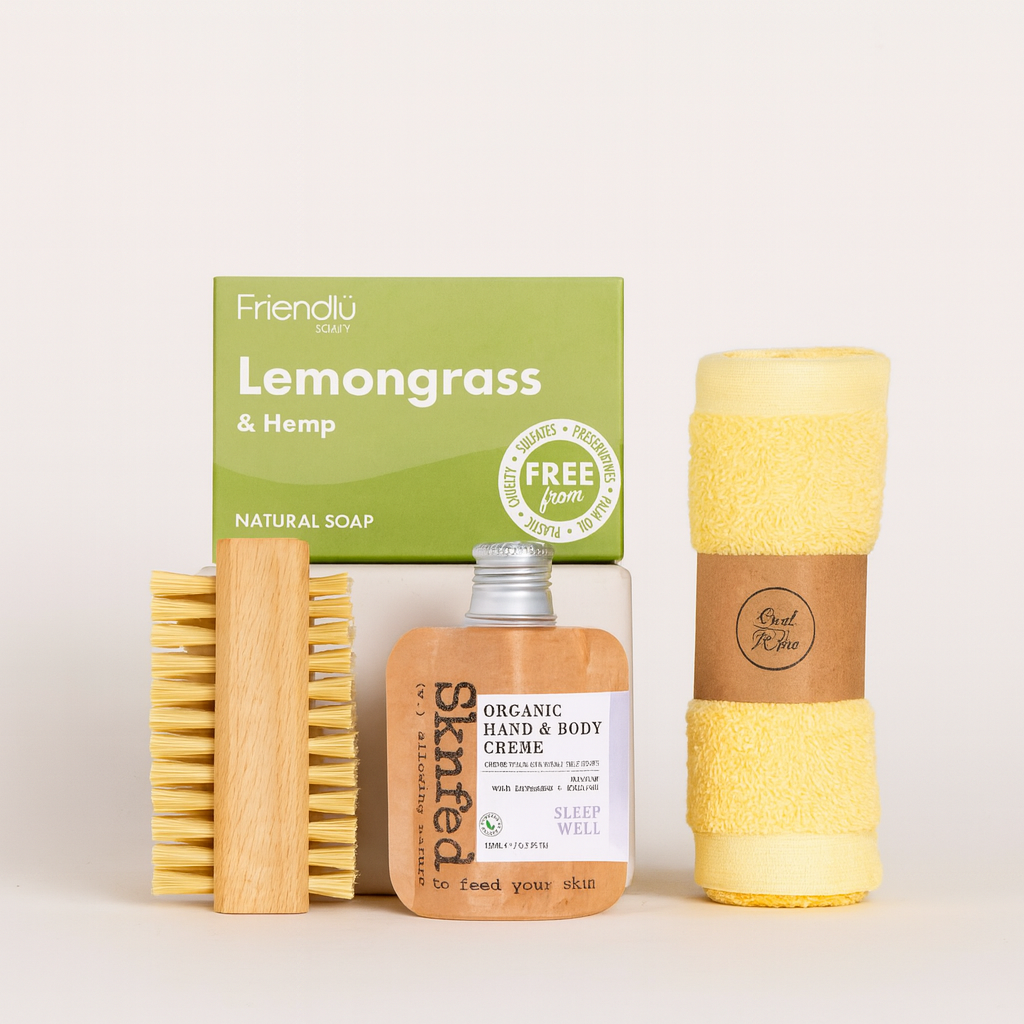 Yellow face cloth + Organic Hand & Body Cream – Sleep Well (SKNFED) + Lemongrass Soap Bar (Friendly Soap) + Wooden Nail Brush with natural sisal bristles