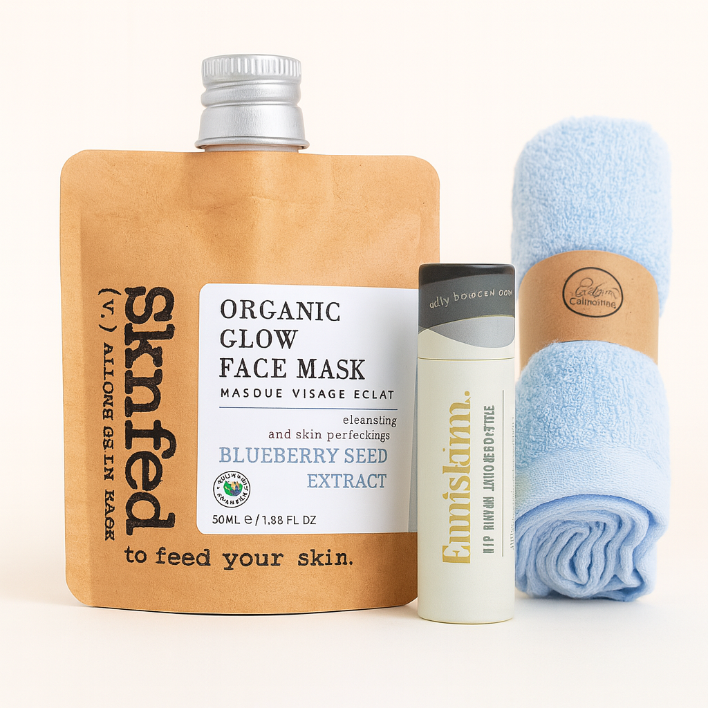 Blue face cloth + Niaouli Lip Balm (Enniskinn) + Organic Glow Face Mask with blueberry seed extract 50ml (SKNFED)