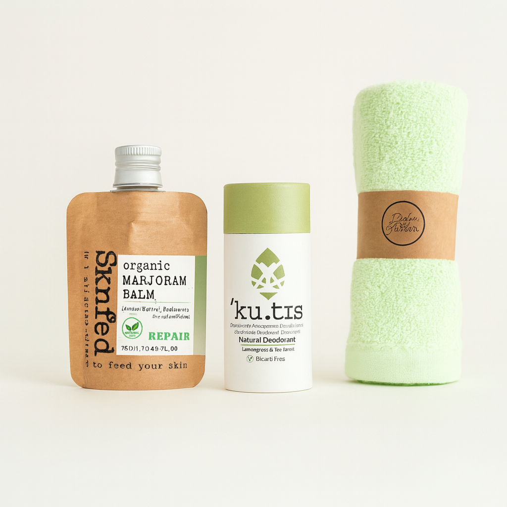 Green face cloth + Bicarb-Free Lemongrass & Tea Tree Natural Deodorant (Kutis) + Organic Marjoram Balm - 25ml (SKNFED)