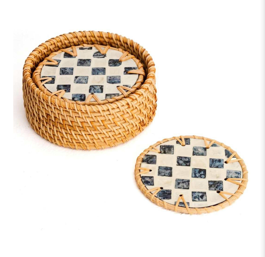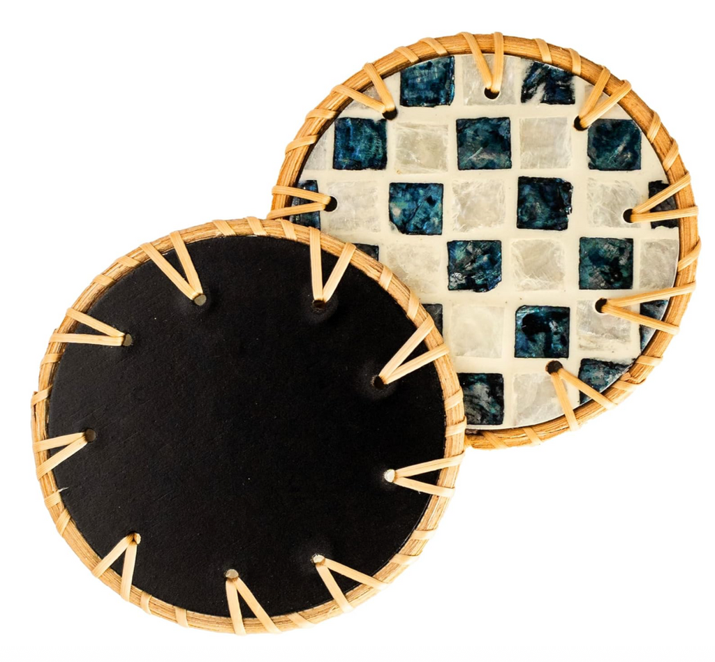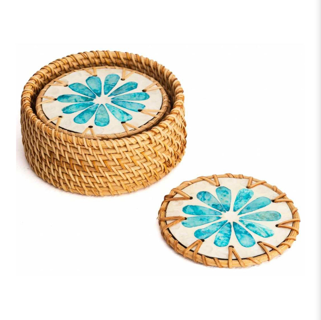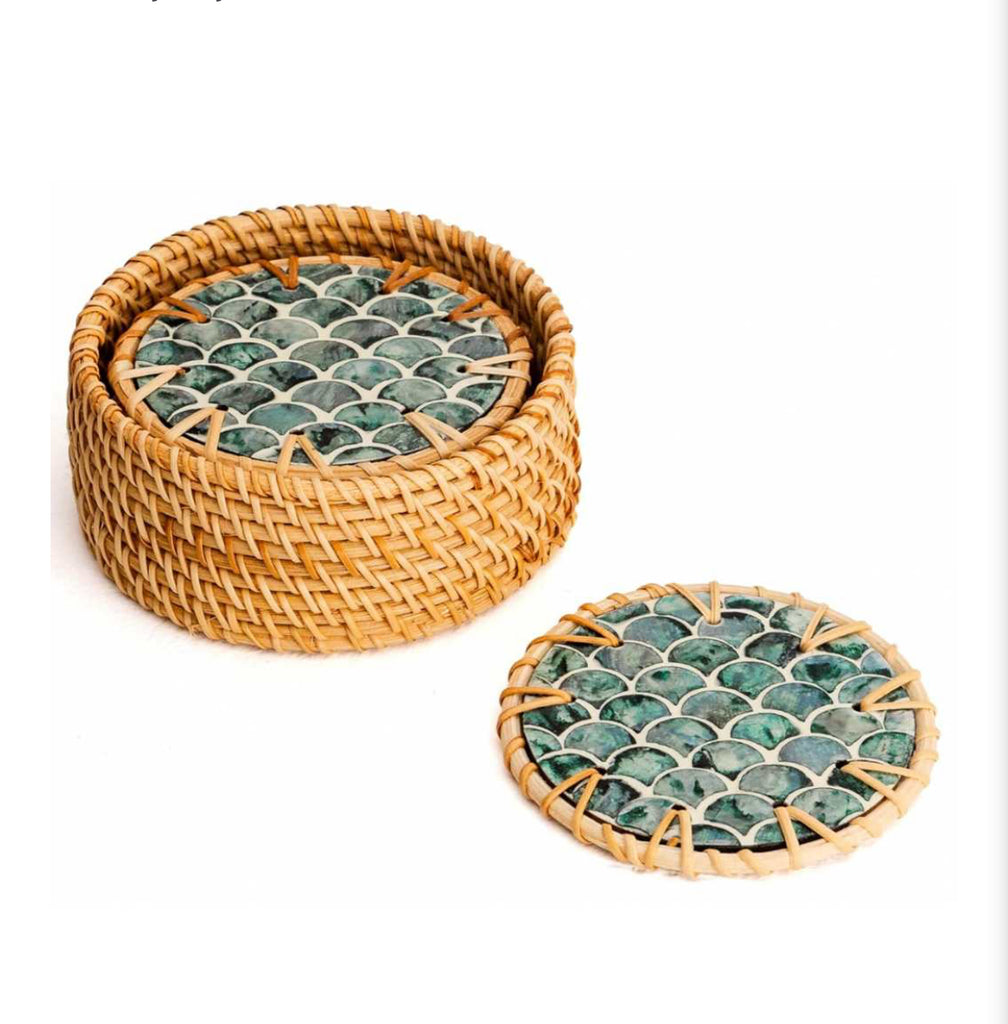 Handwoven Mother of Pearl Coasters with Natural Rattan Holder - Set of 6