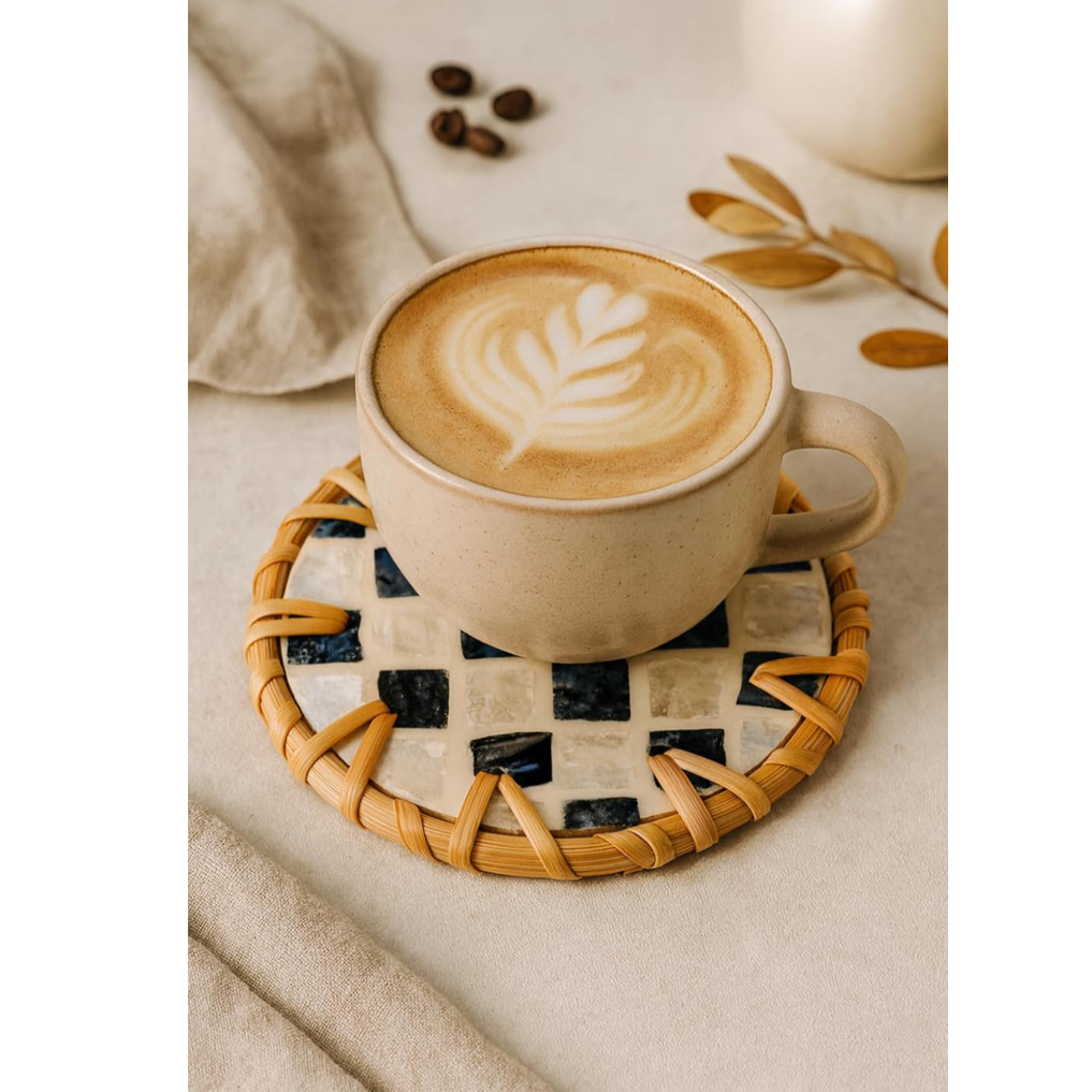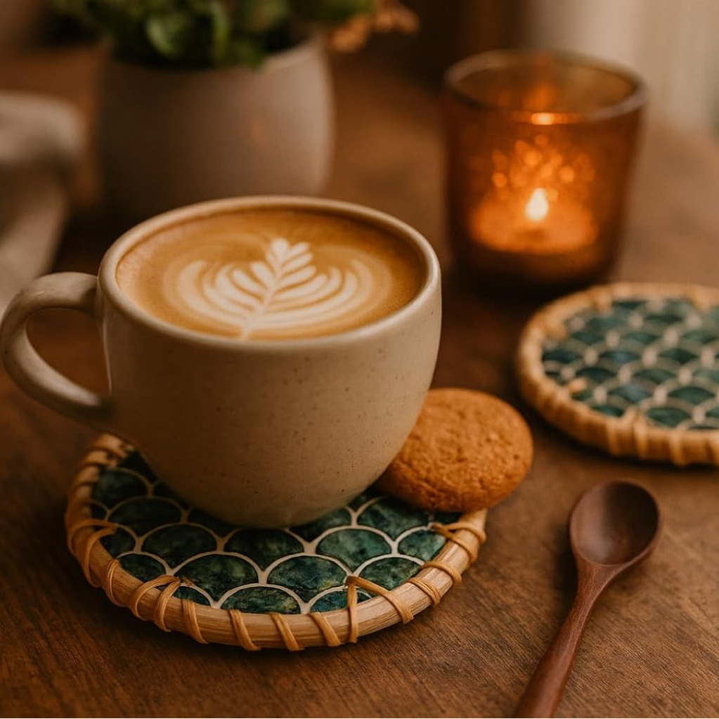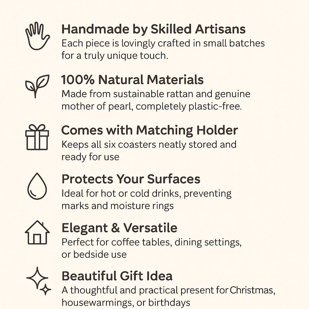 Add a touch of natural elegance to your home with these beautifully handcrafted coasters. Each set includes six round coasters and a matching woven rattan holder — individually made by skilled artisans using fast-growing rattan and genuine mother-of-pearl inlays.